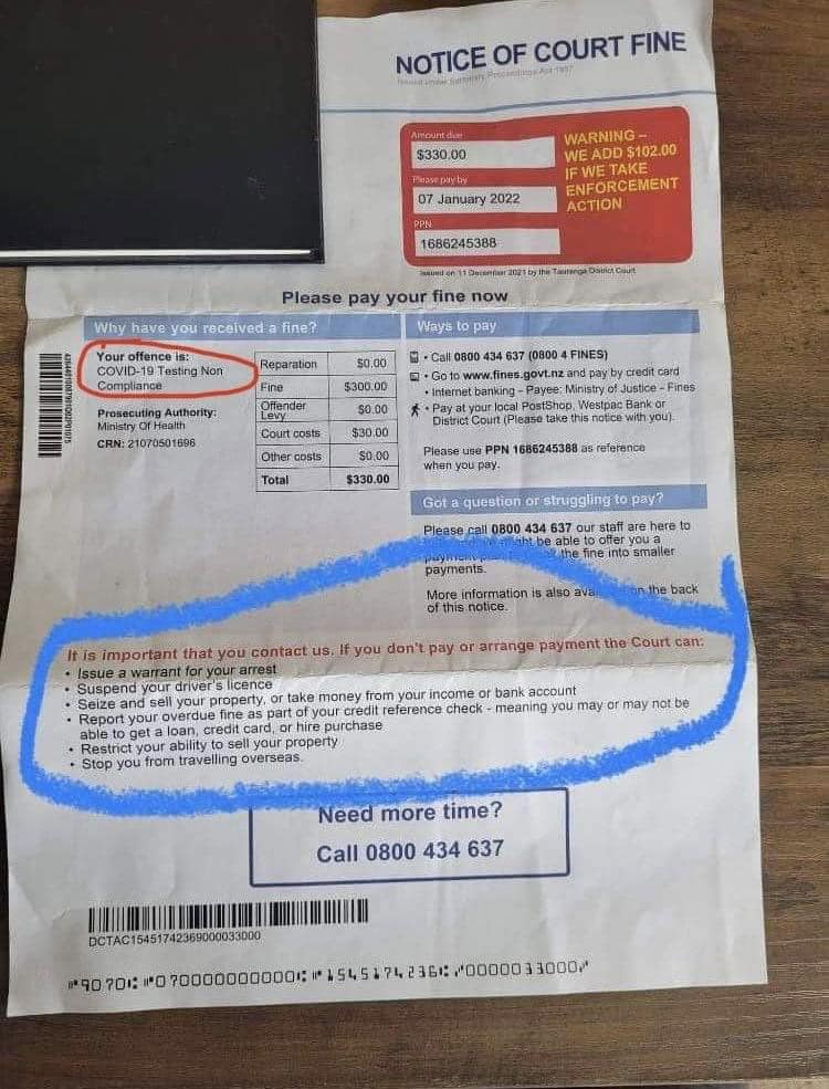 Can you see?The criminals really are running the show now. This is a fine in New Zealand. Look at what they threaten to do if someone doesn’t pay the fine. This is how the communists are going to control everything we do. The cost of non compliance is going to be high. See for yourself. Just for not getting a test that achieves nothing. A test does nothing for your health, right? This is how communism, a social credit system works. It will be so much easier for them to do this when everyone has a digital ID. Just freeze the ID. You are nothing and have nothing. Wake up folks.